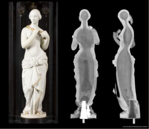 Les matériaux patrimoniaux présentent des caractéristiques très complexes et hétérogènes sur plusieurs échelles. Notre plate-forme multi-techniques permettra d’extraire des informations 2D / 3D complètes des objets. Cela sera possible grâce à un panel d’équipements d’analyse et d’imagerie multi-échelles complémentaires et non invasives, combinant des configurations de tomographie en laboratoire et sur des lignes de lumière synchrotron. Cela permettra de construire une vue d’ensemble 3D multi-échelles de l’artefact. Les informations de cartographie 3D des objets patrimoniaux seront d’un intérêt majeur pour étudier leur provenance, attester de leur état de conservation, préparer leur restauration et disposer de répliques virtuelles pour la diffusion vers le grand public. Ensuite, une sélection des zones pertinentes pour le micro-échantillonnage permettra une seconde session d’études basées sur l’analyse structurelle et chimique plus fine. Des données chimiques pourront être collectées par µ-XRF et µ-XAS et structurelles par µ-XRD et µ-Raman (en laboratoire et au synchrotron). Cette approche rendra possible les études microscopiques statistiques et dynamiques sur ces systèmes. Il s’agira ici de déterminer la réactivité, l’évolution sous atmosphère contrôlée ou les propriétés de transport des systèmes patrimoniaux. Ce suivi « operando » sera réalisé par µ-tomographie, µ-XRD (en laboratoire ou synchrotron) et µ-Raman. Des équipements de tomographie complémentaires permettront la reconstruction 3D d’objets constitués des matériaux de nature très différente (matériaux organiques, bois, plâtre, terre cuite, métaux, pierre) et à différentes échelles.